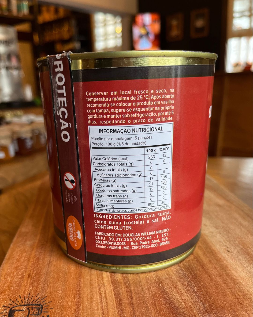 A Carne na Lata Ribeiro é feita pelo Douglas com Costelinha de Porco Caipira, com muito carinho e tradição no coração da Canastra. É temperada com sal e alho, mas o segredo é o fogão à lenha que torna a receita muito mais especial. Seu sabor traz a simplic