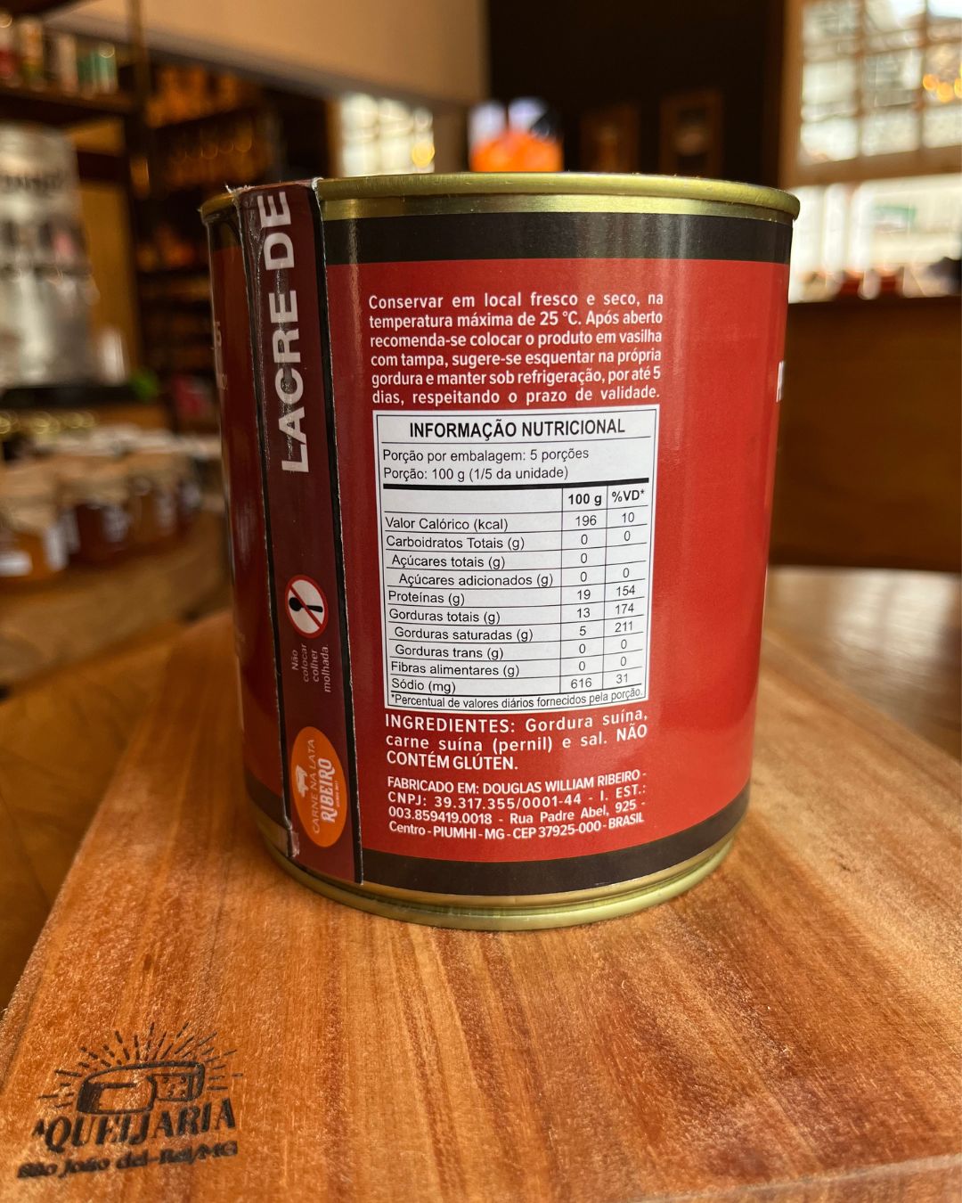 A Carne na Lata Ribeiro é feita pelo Douglas com Pernil de Porco Caipira, com muito carinho e tradição no coração da Canastra. É temperada com sal e alho, mas o segredo é o fogão à lenha que torna a receita muito mais especial. Seu sabor traz a simplicidad