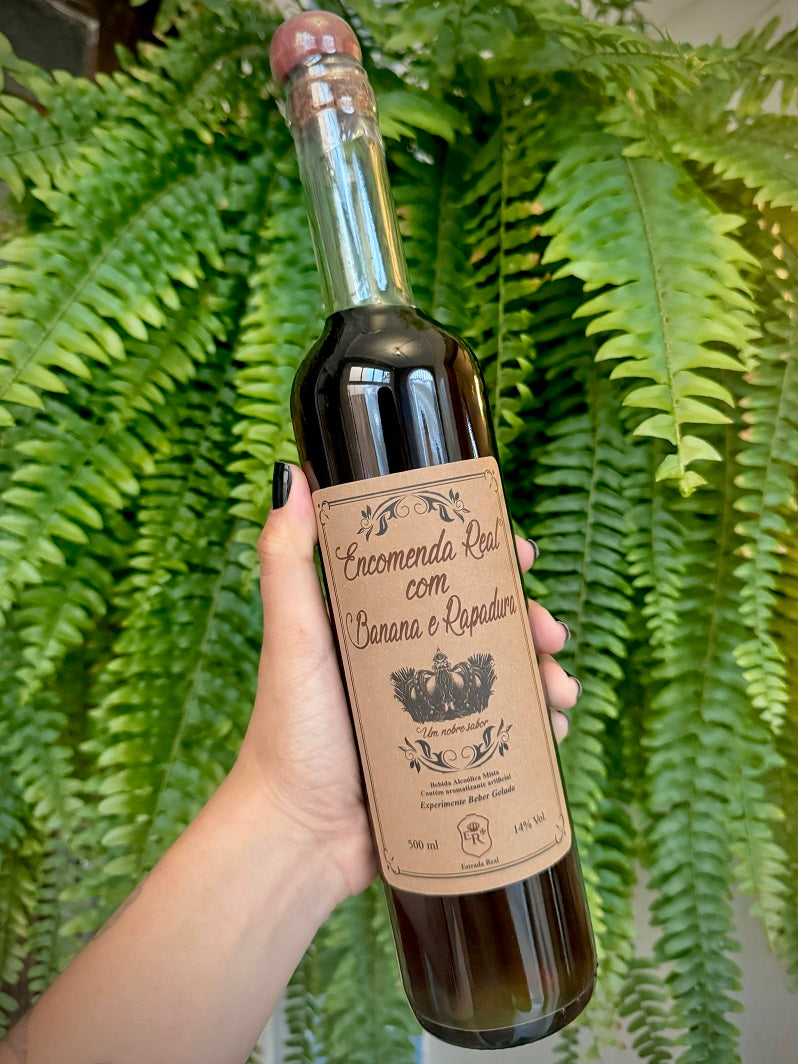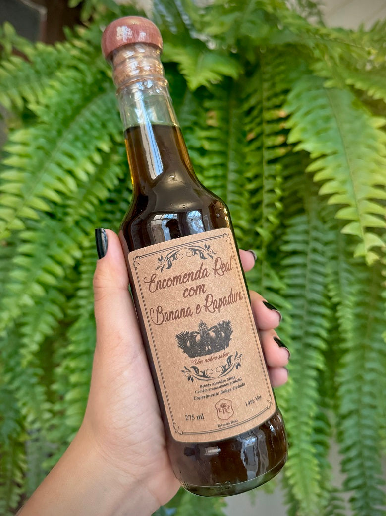 Descubra a Encomenda Real Banana com Rapadura, bebida alcoólica artesanal com sabor único e 14% de álcool. Ideal para quem busca uma experiência tradicional e saborosa. Disponível em 275ml e 500ml.