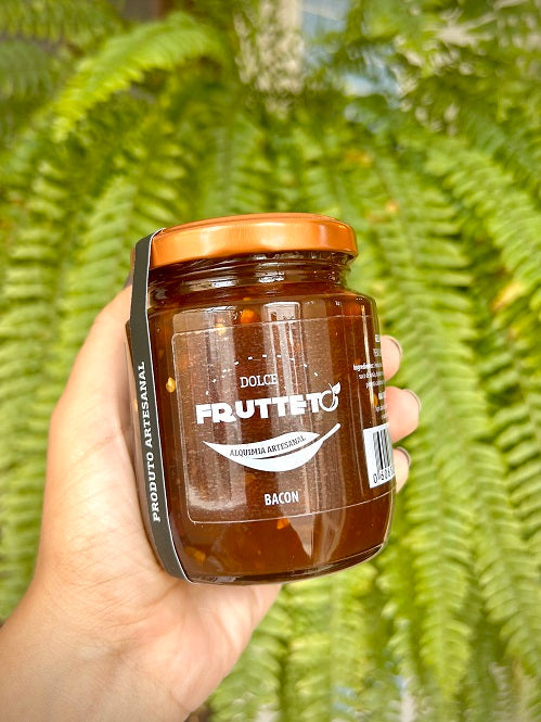 A Geleia Dolce Frutteto de Bacon é produzida artesanalmente em Carmópolis de Minas - MG. É uma mistura perfeita, de sabor defumado, com toque agridoce e rústico proporcionando uma combinação perfeita para acompanhar hambúrgueres, queijos e carnes. Ao cont